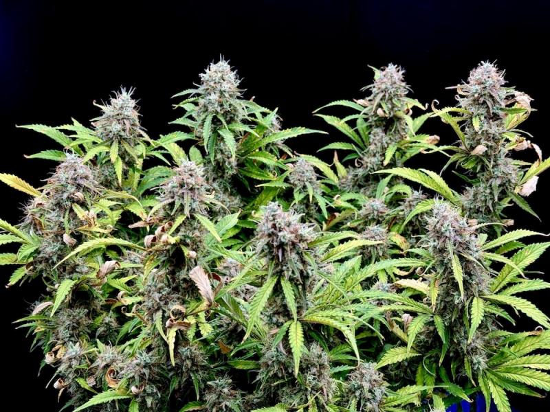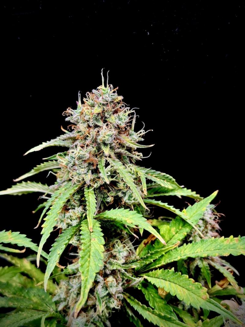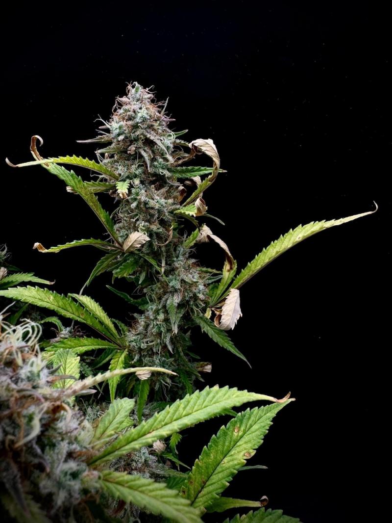 Букет выраженный, десертно-пряный: ноты «печенья» и землистости с мягкими штрихами дизельного и цитрусового направления. Аромат раскрывается насыщенно и ровно, без резких оттенков. После пролёжки становится более многослойным. Соцветия визуально «морозные» за счёт активного смолообразования.